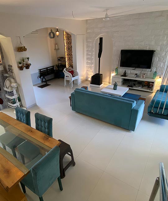The blue flat is a serene and tranquil living space, enveloped in a soothing blue hue that evokes feelings of calmness and relaxation. The walls, painted a soft sky blue, provide a gentle backdrop for the external sea view.